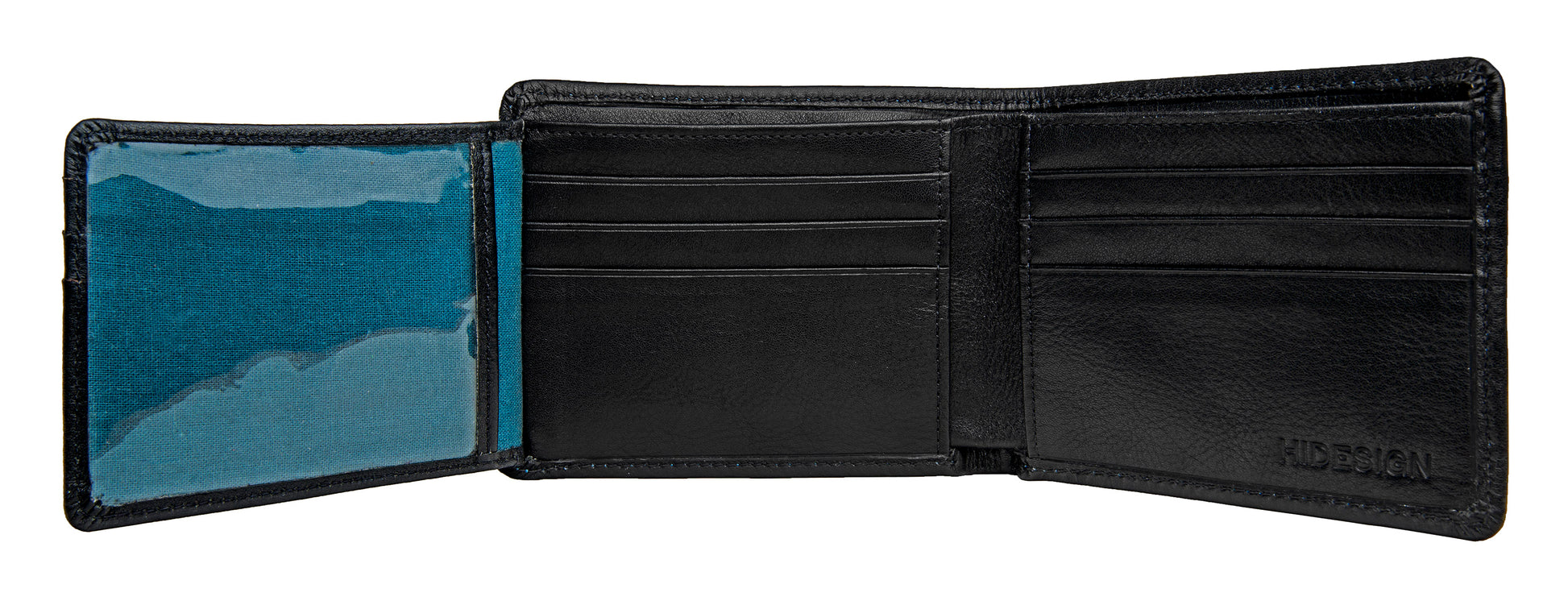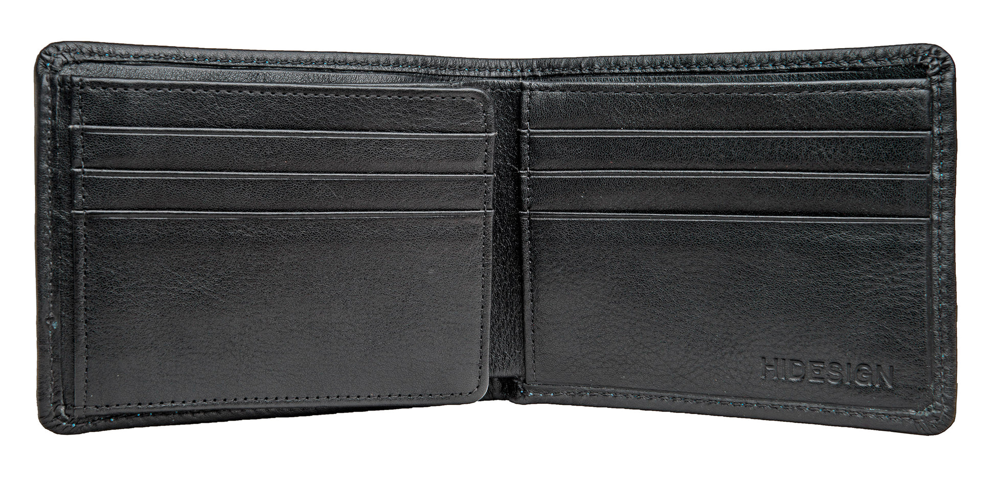 Our contrast stitch leather wallet lets you stay organized in style. The black leather wallet features a blue contrast stitch and blue cotton lining - such a fun pop of color when you open it up!